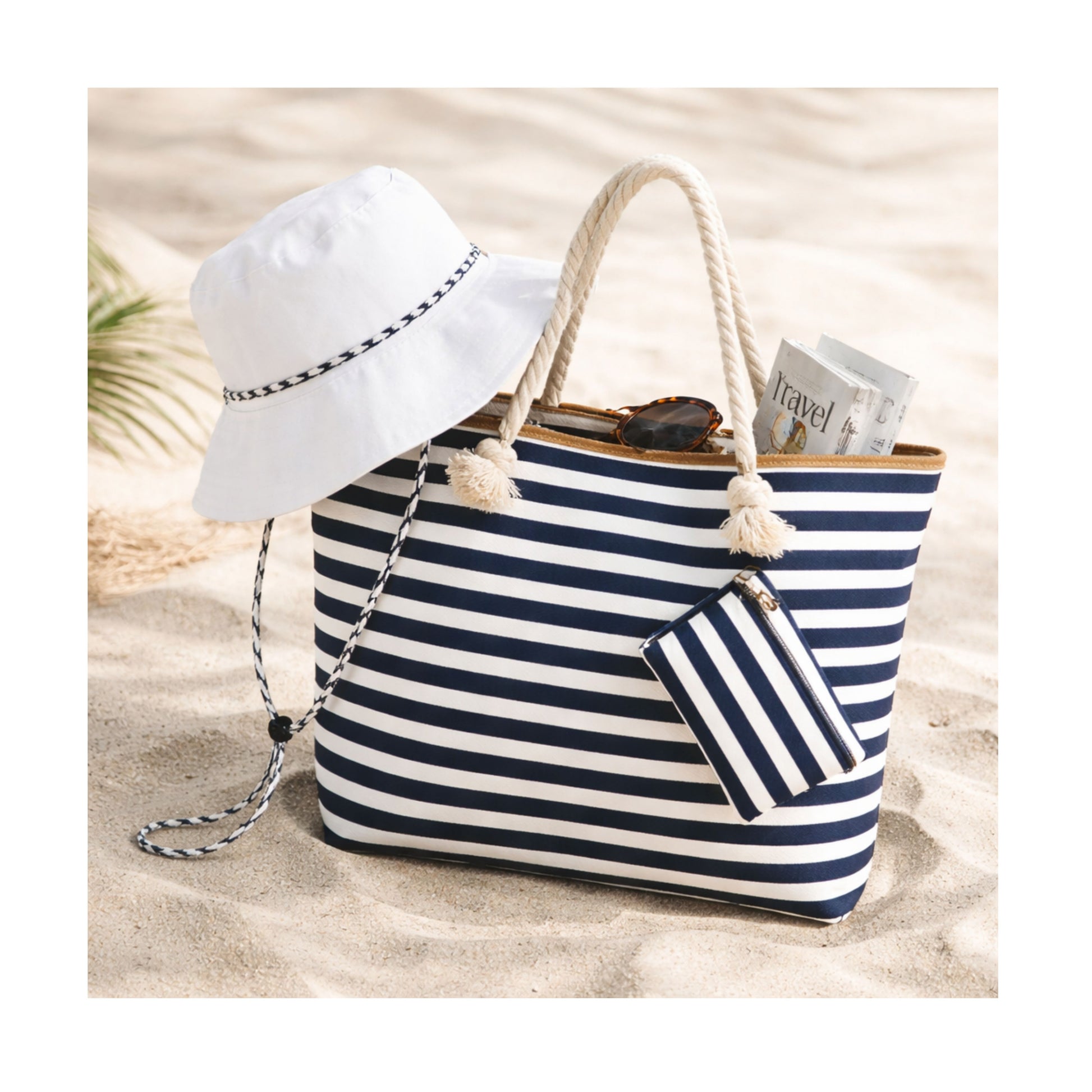 Dockside Tote With Wallet: This is the go-to nautical tote style for the Summer. It is lightweight with navy stripes and soft rope handles. The oversized tote features a top zipper closure, oversized, measuring: 20.5" x 14.6" able to wear as a shoulder bag. 100% Polyester. Includes an attached pouch that measures 5.9" x 3.9".