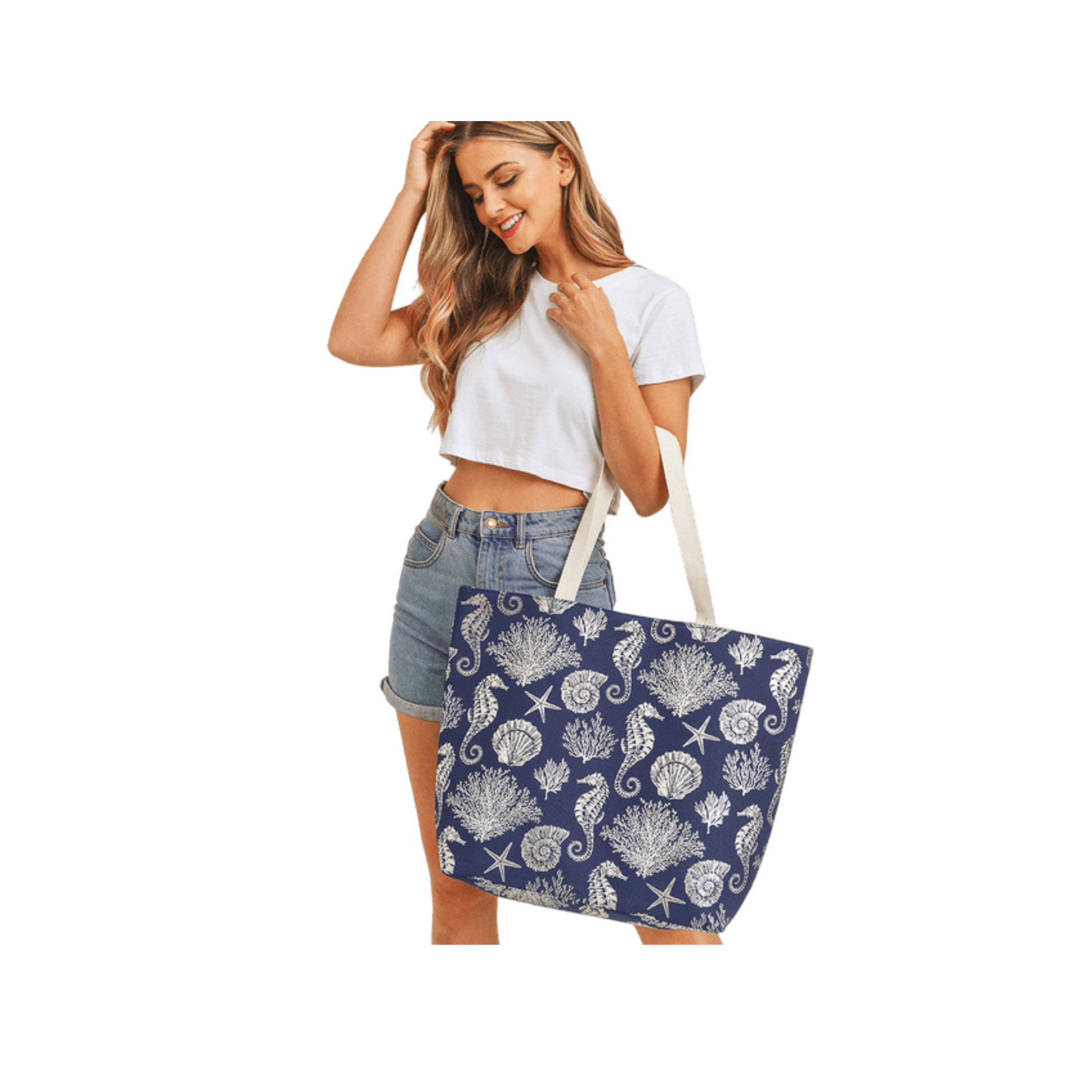 This is the go-to tote style for Spring and Summer. It is super lightweight and has a silver foil ocean life pattern with soft fabric handles. There is a top magnetic closure, and the inside is completely lined with an inside slip pocket. It has a smooth polyester beach bag feel. Dimensions: 16" tall by 20" wide, 5” deep