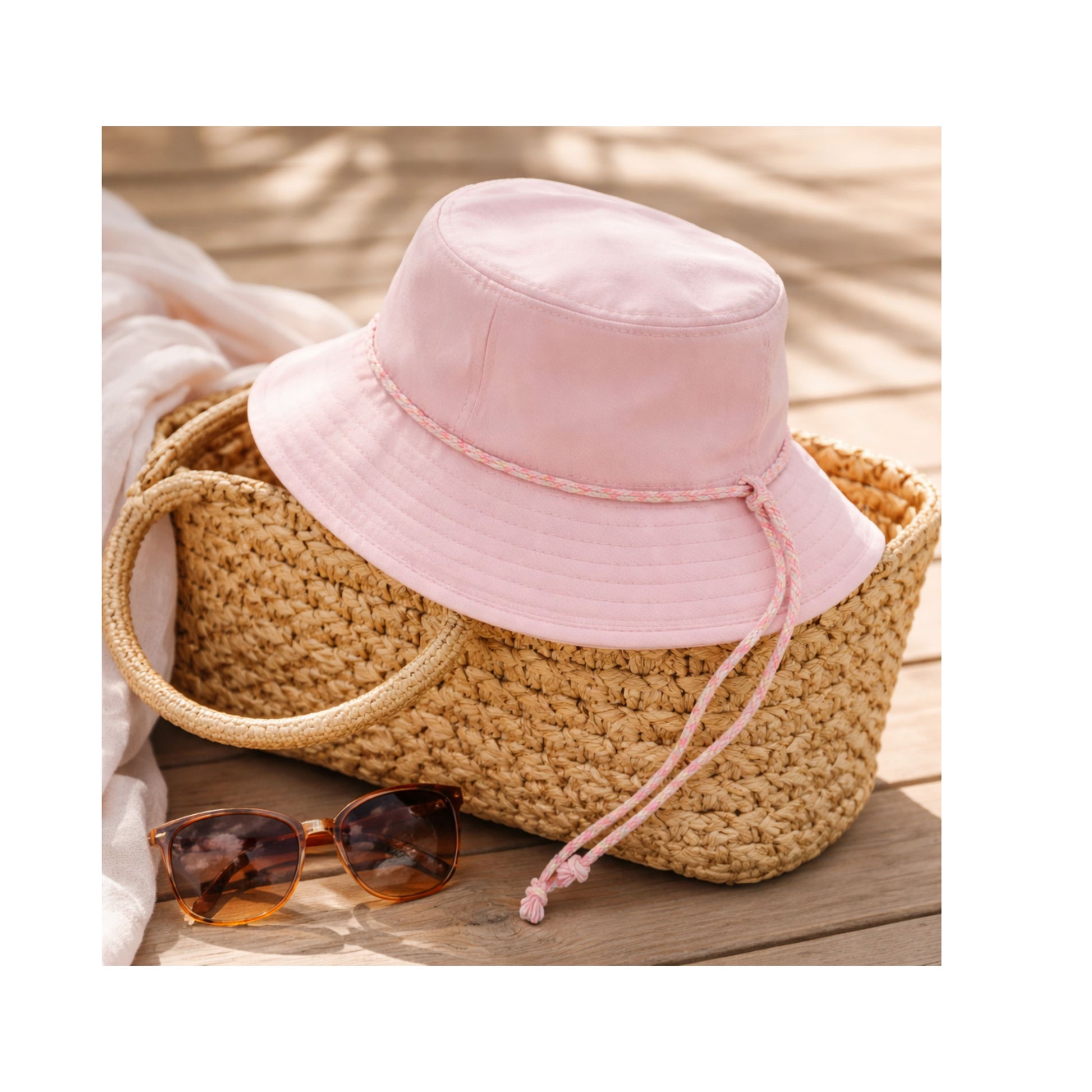 Our super cute Sophie Bucket Hat in pink: a great way to keep you protected from the sun complete with an adjustable chin cord, you won't lose this hat to the wind! 100% cotton. One size.